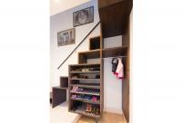 玄関の土間収納にあるご主人の書斎へ続く階段。収納になっており最下段にはルンバが収納できます。