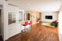 デザイン階段や広々とした吹抜けのある玄関ホールと、生活領域であるLDKの間に、可動間仕切りを配置し、一体化して使用できるように工夫しました。