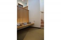 和の照明と珪藻土の壁が旅館のような非日常を演出